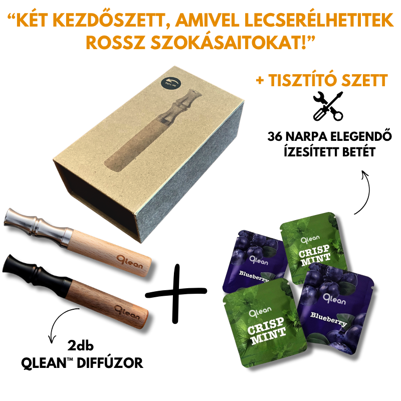 A csomag része egy Qlean Diffúzor, 18 napra elegendő ízesített betét és egy tisztítószett. Így neked már csak a természetesen szokásaidat kell kialakítanod!